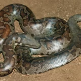 ホシニラミスナボアは、全長40cm程度のスナボア属の小型種です。ほとんど真上を向くような位置に眼があります。この形態は、体を砂の中に埋没させて眼だけを露出させ、獲物が近づくと捕食するためです。体色は淡褐色を基調として、背面に鮮やかな橙色の斑紋が乱れたバンド状に入ります。
